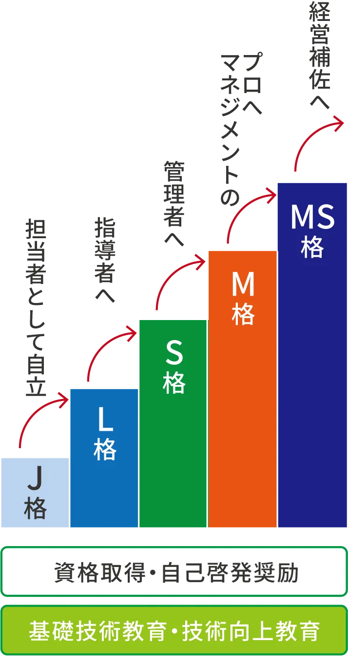 入社1〜2年後までのJ格から経営補佐を目指すMS格まで、