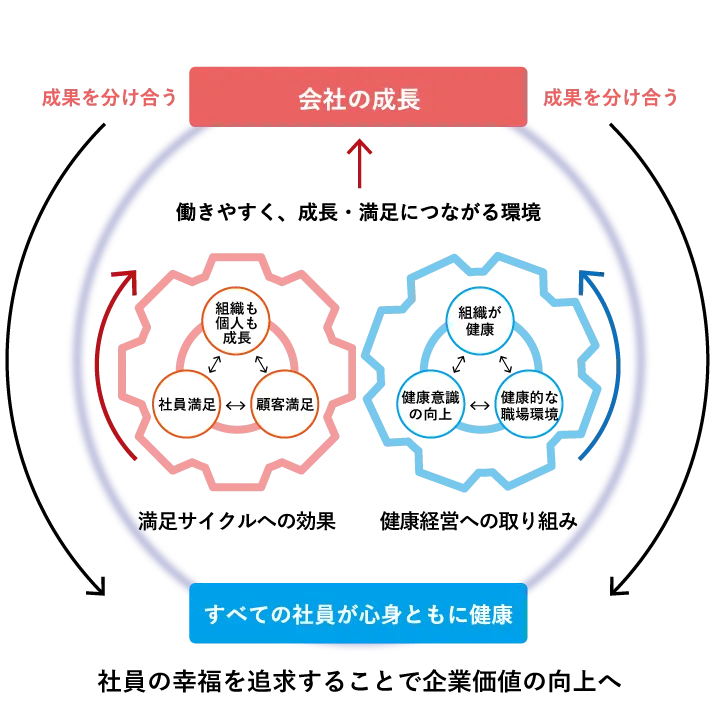 健康経営社員と組織の成長によって得られた成果を分かち合う。